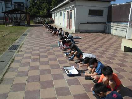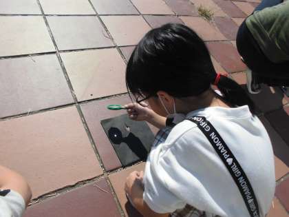 鏡で光を集めると、日光のあたためる力が強くなることを学習しました。虫めがねを使ってさらに実験してみました。光をあてた用紙からけむりがあがる様子をみて「わぁ!」と声が上がっていました。