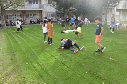 だんだん成長してきた芝生をさわって、少し愛着がわいてきたようです。