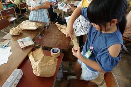 紙をくしゃくしゃして、ぎゅっと抱きしめると・・・何だか、いろいろな形に見えてきました。見えてきたものの形にさらに近づくよう、縛ったり貼ったりして、形を整えました。完成した作品は、持ち帰っています。何に見えたのか、お話してみてください。