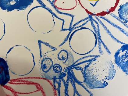絵の具と色々な容器などを使って、好きな形を画用紙にうつしました。うつした形を生かしながら、クレパスで動きを描きたし、海の中などを描いていました。