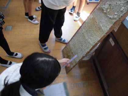 土地がしま模様に見えるのは,どうしてかを標本を使って観察しています。