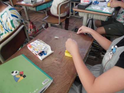 電気が生活の中で役立つことをみんなで話し合った後、どうすれば豆電球に明かりがつくかを考えました。