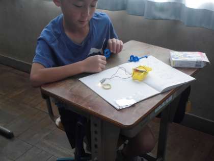 豆電球と乾電池を輪のようにつなぐと、豆電球に明かりがつくことを発見し、「ついた!」と多くの声が上がっていました。