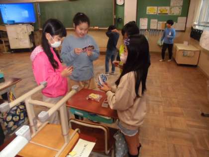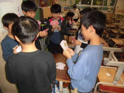 雨でお外で遊べませんが、教室でカードゲームをしたり友達とお話したりしながら、落ち着いた時間を過ごしています。