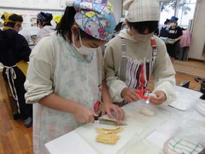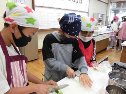 班の仲間と協力しながら、みそ汁に使う具材を切っていました。