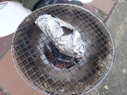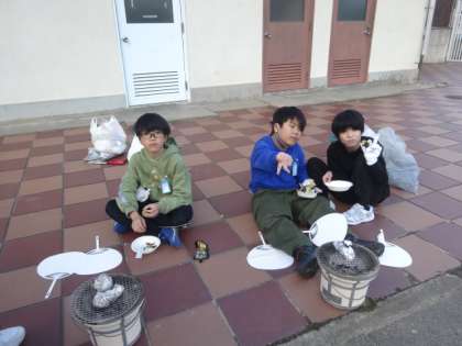 協力して、七輪の炭に火をつけ、アルミホイルで巻いたさつまいもを焼きました。おいしそうな焼きいもの香りが漂っていました。