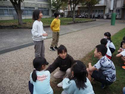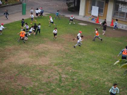 運動委員会では、遊びのイベントを企画し実際に運営しています。今日は2年生のおにごっこイベントを企画しました。2年生をしっかり引っ張っていました。