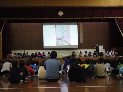 今日は人権集会でクラスの人権標語を発表しました。クラスで決めた人権目標について考え、新たに人権標語を作りました。2組標語「相手の気持ち考えて言い方と行動をよくしていこう」