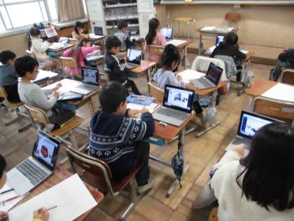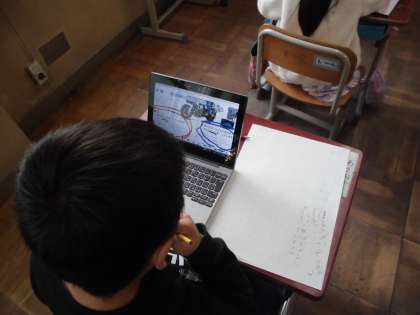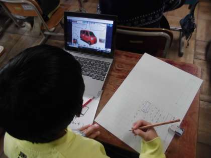 パソコンを見ながら、自分の選んだ自動車についてまとめています。