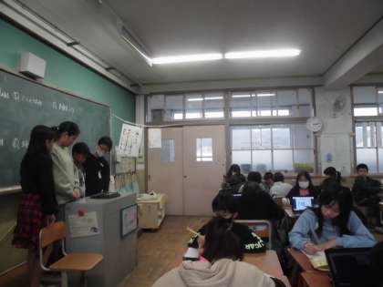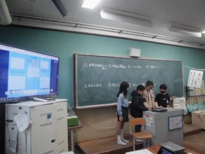 アドバイスをもらって直したオリジナル献立を発表しました。それぞれの班の工夫が見られ、よく考えられていました。聞いている人たちも真剣にメモをしながら聞いていました。