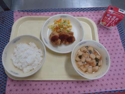 今日の給食は、ごはん、牛乳、ヒレカツ、野菜のソテー、みそ汁です。