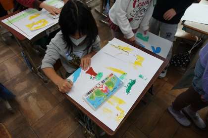 画用紙を動物の形に切って、すてきな世界を表現しました。パスを使って付け足しをして、作品を仕上げていきます。