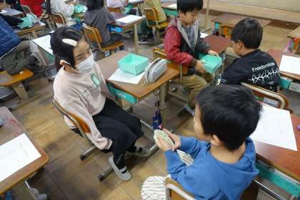 野菜の言い方を学習しています。お店屋さん役の人が必要な野菜の数を質問して、お客さん役の人が数を答えます。言い方に慣れるまで、何度もやりとりをしていました。