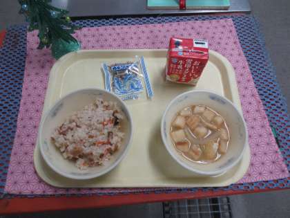 今日の給食は、炊きこみ五目ごはん、牛乳、みそ汁、じゃこです。