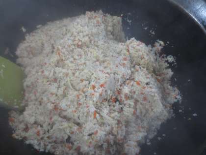 給食室で保管している備蓄米で炊きこみ五目ごはんを作りました。