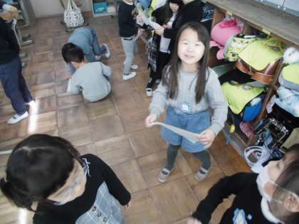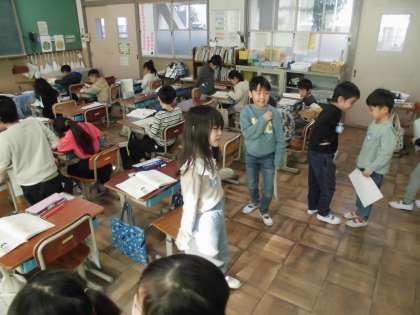 授業で交流をする時間、考えを後ろのスペースでお友達と交流をしています。