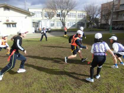 体育科では、『陣取りゲーム〜タグラグビー〜』の学習を行こなっています。ルールにも慣れてきて、熱い熱い戦いが繰り広げられています。どれだけ熱いかというと、芝生広場を『東大阪市花園ラグビー場』かと見間違うくらいです。
