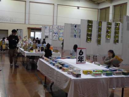 それぞれの学年が展示されていてたくさんの作品を前に、子どもたちは目を輝かせながら鑑賞していました。