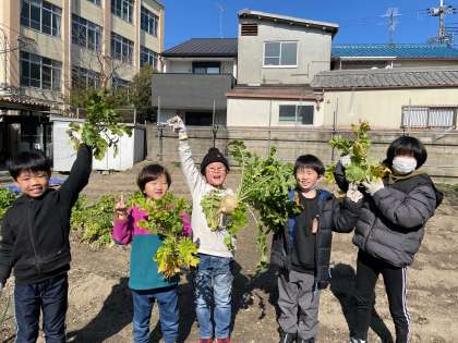 大根や聖護院大根を収穫できてうれしそうです。