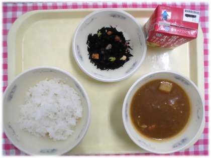 今日の給食は、ごはん、牛乳、チキンカレー、ひじきのソテーです。