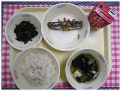 今日の給食は、麦ごはん、牛乳、さんまのしょうが煮、ほうれん草のおかか煮、すまし汁です。