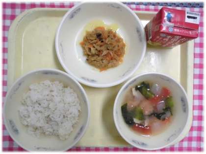 5月9日の給食は麦ごはん、牛乳、ツナそぼろ丼(具)、トマトだご汁です。