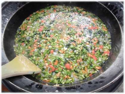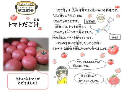 トマトだご汁には調理員さん特製の手作りのだんごが入っています。ひとつひとつ形のちがうだんごをよくかんでしっかりと味わいました。