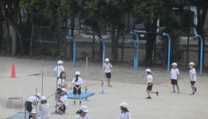 体育科の学習では、『高とび』の学習に入りました。「1・2 1・2・3」のリズムで踏み切れるように、試行錯誤の繰り返しです。