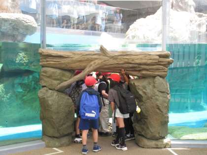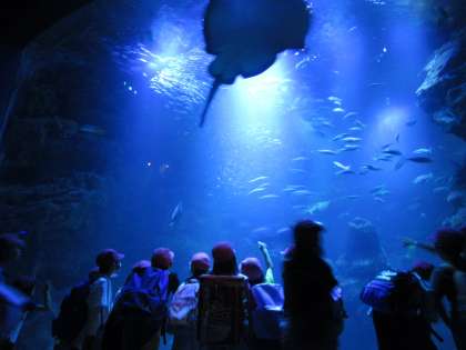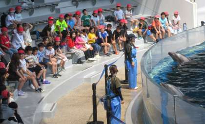 京都水族館ではさまざまな生き物を見ました。イルカスタジアムではイルカのトレーニングの様子を見学しました。イルカのジャンプに合わせて「わあ!」という歓声があがっていました。
