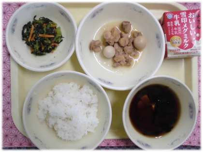 6月7日の給食はごはん、牛乳、鶏肉のさっぱり煮、だいこん葉のごまいため、赤だしです。