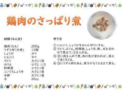鶏肉のさっぱり煮は、鶏もも肉とうずら卵をみりんやしょうゆ等で甘からく煮込んだ献立です。お酢を使うことでさっぱりとしたあじわいに仕上げています。また、にんにく、しょうがの2種類の香味野菜を使うことにより、食欲をかきたてる効果もあるといわれているので暑い夏にはぴったりの献立です。