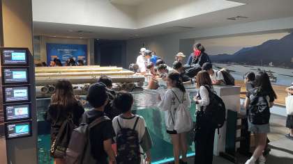 厳島神社の次は宮島水族館の見学です。グループごとに相談しながら見学しています。