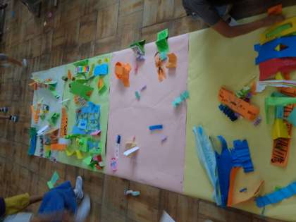 今日は作った作品をみんなで並べてみました。友達と一緒につなげて楽しんでいる様子や、自分の作品をたくさん並べて考えを広げている様子が見られました。次は友達の作品や自分の作品を見て、いいところをたくさん見つけようと思います。