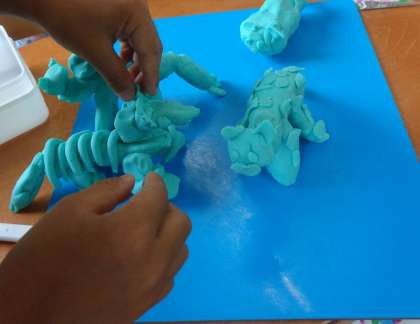 今日は、一緒にお散歩してみたい動物を考えながら粘土で表現してみました。「ヘラクレスオオカブトに乗って空を散歩したい!」「ウミガメと一緒に海を泳いでみたい!」など、楽しそうな散歩の様子が聞こえてきました。次はどんな動物とお散歩するのか楽しみです!