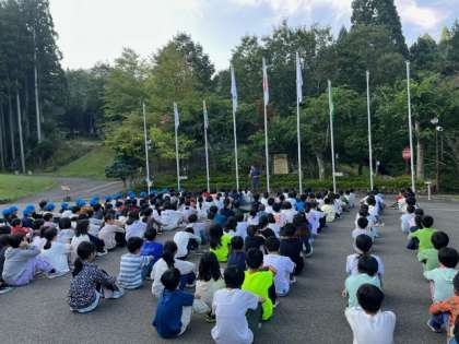 2日目のスタートです。3校で朝の集いをしました。それぞれの学校紹介を聞き、嵯峨野小学校との違いに驚いていました。これから朝食を食べ、登山にむけての準備を進めていきます。