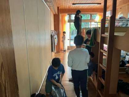 登山を終え、お風呂で汗を流しています。余った時間は、荷物整理をするなど、それぞれの時間を過ごしていました。