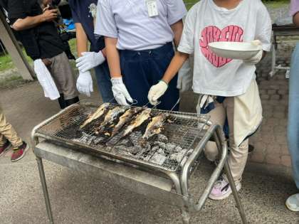 捕まえた魚を捌きました。ほとんどの子どもが捌いた経験がなく、苦労をしていましたが、「いただきます」の意味について、感じ取ることができました。捌いた魚は美味しくいただきました。