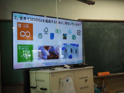 総合的な学習の時間では、SDGsの学習をしています。実際に会社ではどんな取組をしているのかゲストティーチャーに来ていただき、お話をお伺いしました。SDGsの目標や取組について知ることができ、また自分たちができることはないかと考えることができました。