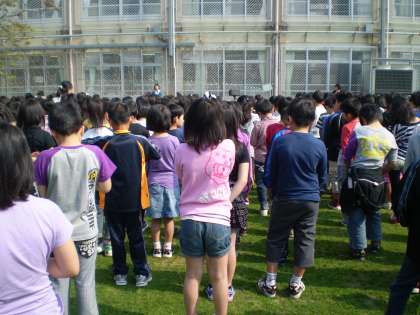 3年生になって初めての朝会。子どもたちは新しいクラスの並び方ですばやく並ぶことができました。青い芝生の上で,さわやかな風に吹かれて,校長先生の話をしっかりと聞くことができました。