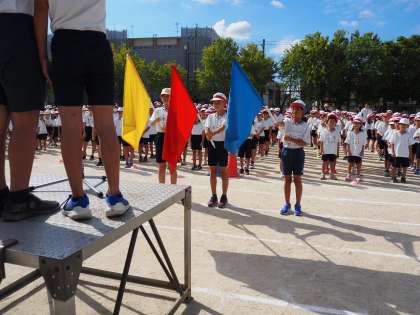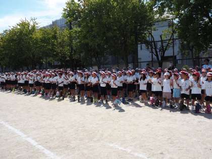 全校練習をしました。エール交換や開閉会式の流れの確認をしました。暑い中よく頑張っていました。
