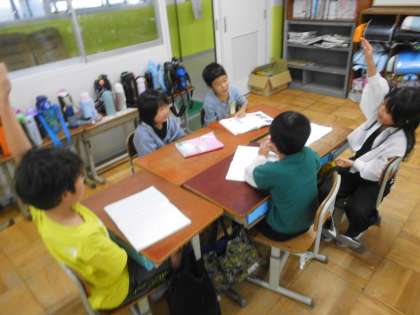 国語の授業で話し合いをしました。自分がそうだんしたい話題をきめて、班の人と話し合いました。