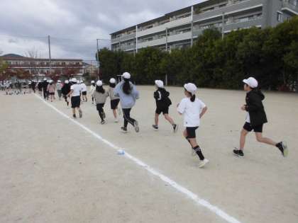 持久走記録会の本番に向けて、アップをしている様子です。みんなで走ったり、スキップをしたりして、体を温めました。