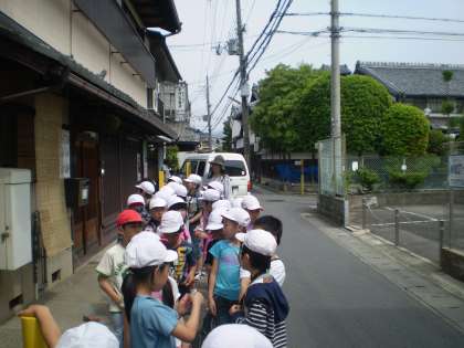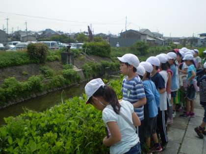 今日はとうとう最後の校区たんけん,南コースへ出かけました。南コースには,いたるところに畑があり,子どもたちもナスやトマトやキャベツの畑を見付けていました。また,有栖川では,大きなコイや大きなカメがたくさん泳いでいるところを見付けることができました。南コースには,「しぜんいっぱいコース」「花いっぱいコース」「生き物いっぱいコース」などと名づけ,今までのコースとの違いも十分に感じ取ることができました。
