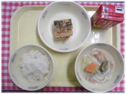 今日の給食は減量ごはん、牛乳、さばのたつたあげ、豆乳鍋(うどん入り)です。