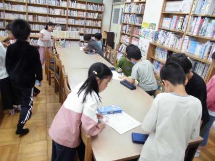 グループに分かれて、嵯峨野小学校の図書室を探検しました。本の分類や、どこにどんな種類の本が置かれているかを調べて、地図を作りました。