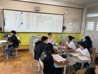 国語科では、「聞いて、考えを深めよう」の学習を進めています。学校に関わる人にインタビューをする為にグループ毎に練習をしています。