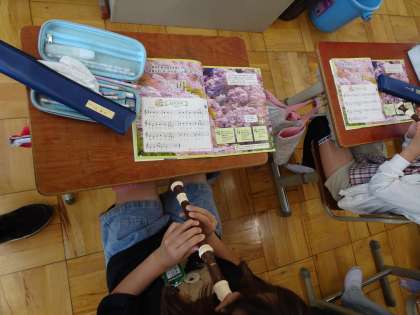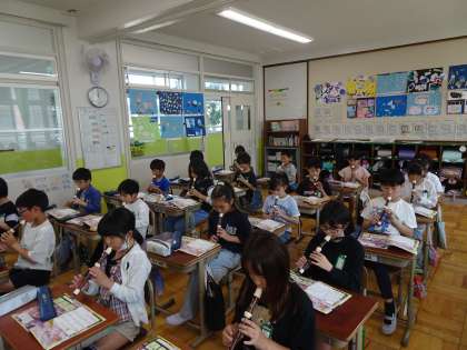 「いいこど ありそう」は弾むようなリズムで、子どもたちは体や手を動かしながら歌っています。また、鍵盤ハーモニカやリコーダーなど、歌側と演奏する側に分かれて音色を響かせ、楽しそうに学習を進めています。