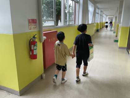 2年生のお兄さん、お姉さんと一緒に学校探検をしました。「この教室には何があるの?」「この部屋には誰がいるの?」と質問をして、2年生に教えてもらいながら、探検することができました。