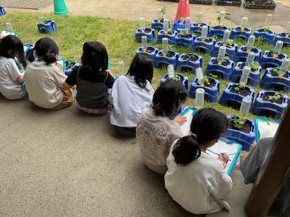 先日植えた野菜の苗の観察をしました。野菜の種類によって、苗の様子も違います。「毛みたいなのが生えてる!」「もう小さいつぼみがついてる!」など、細かいところまで詳しく観察できました。