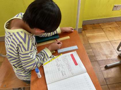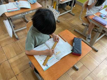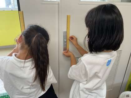 教室内の色々なものの長さを予想して、ものさしで測りました。学習が進むにつれて、物差しの使い方も上手になっています。積極的にものさしを使い、たくさん長さを測っていました。